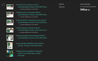 Wiosna przynosi optymizm. Dla wszystkich, którzy chcą zrobić sobie prezent, przygotowałem nową ofertę - kompletny zestaw CA80 RCbus do własnego montażu w cenie CA80 mini. Poza formatem i liczbą płytek różnią się tylko wyświetlaczem. Żeby wyśrubować cenę musiałem na czymś zaoszczędzić. Oczywiście inne wyświetlacze też są dostępne i można skompletować swój zestaw modułów, albo wybrać któryś z przygotowanych przeze mnie. Obniżyłem też ceny wszystkich zestawów. Mam nadzieję, że ta wiadomość kogoś ucieszy.